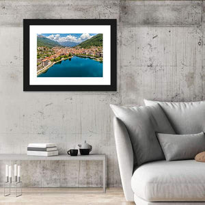 Aerial View of Omegna shows a city on a lake with red tiled roofs and snow-capped mountains, painted in blues, greens, oranges, and white. The peaceful, scenic and vibrant image works well in modern living rooms, dining areas, or office walls that need a calm focal point.