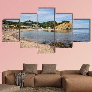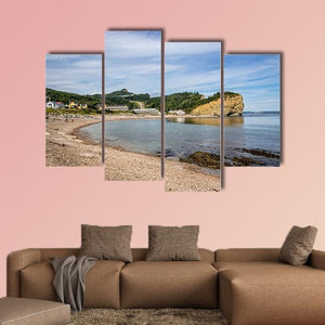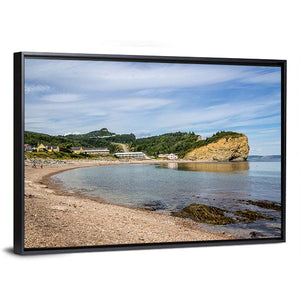 View of Perce village in Quebec, Canada captures a naturalistic coastal landscape with a rock arch, pebble beach, ocean and small buildings on a hill. The blue-green palette and calm rule-of-thirds composition give a serene, daytime summer mood that suits coastal or modern room decor.
