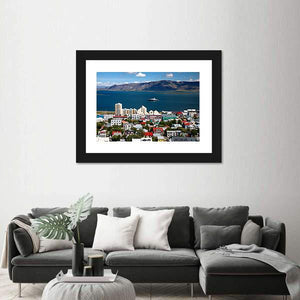 This canvas art captures a scenic view of Reykjavik, featuring vibrant city buildings framed by lush ocean waters and majestic snow-capped mountains. The tranquil atmosphere and bright palette invite a peaceful ambiance, making it a wonderful addition to your decor.