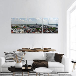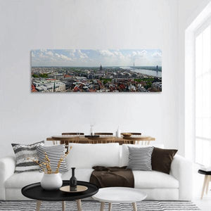 A panoramic canvas showing Riga’s city skyline with the river, bridge, varied rooftops and a tall, slender tower beneath a bright summer sky. The photorealistic, expansive scene — in blues, grays, reds and whites — brings a clear, urban feel that suits modern living rooms or offices looking for city-focused wall decor.