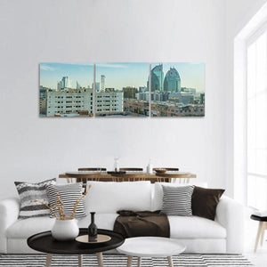 This panoramic canvas shows a wide daytime skyline of Riyadh, Saudi Arabia, featuring twin domed skyscrapers and low-rise buildings beneath a clear blue sky. The modern, bright cityscape in blue, white, gray and tan tones works well in contemporary living rooms or offices as a calm urban focal point.