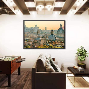 This canvas art captures the historic skyline of Rome, showcasing its iconic domes and grand churches. The warm palette of yellow, orange, and grey evokes a serene atmosphere, perfect for enhancing any space.