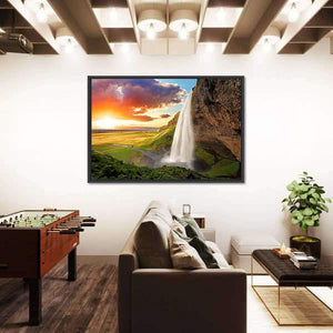Experience the breathtaking beauty of Seljalandsfoss Waterfall in Iceland. This landscape canvas captures the dramatic interplay of cascading water against a backdrop of vibrant green hills and an awe-inspiring sunset, creating a striking focal point for your space.