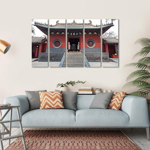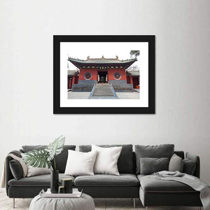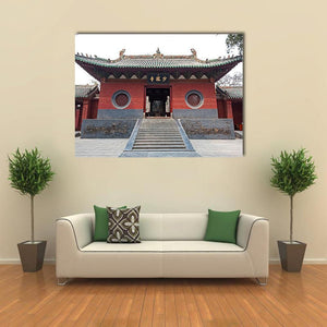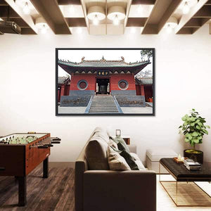This canvas art captures the grand entrance of the Shaolin Temple in China, featuring stone stairs and a striking pagoda roof. The serene palette of red, green, and grey enhances the historic and traditional vibe of the scene.