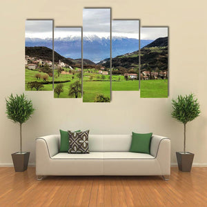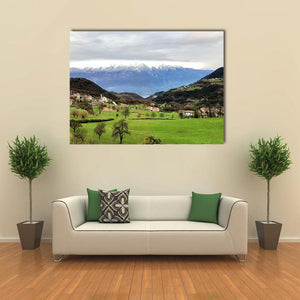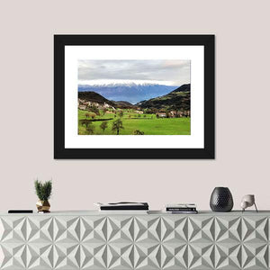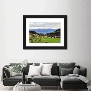 View Of South Tyrol depicts a mountain village set among green fields and trees, with distant snow-capped peaks and a cloudy sky. The realistic, picturesque scene feels peaceful and scenic, with red-roofed houses providing a warm focal point. It suits modern or nature-inspired rooms looking for calm, nature-focused wall art.
