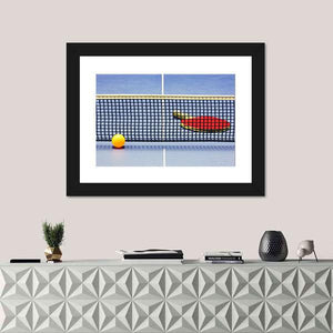 A close-up panoramic view of a ping pong table in play, showing a red paddle with yellow accents, a ball and the net’s grid pattern. The modern, graphic composition feels sporty, dynamic and focused. Works well in game rooms, sports spaces or contemporary interiors that welcome bold color and movement.