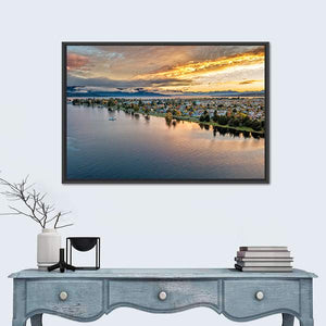 This serene landscape captures the tranquil beauty of Te Anau Lake in New Zealand, showcasing fluffy clouds and distant peaks. With its photorealistic style and a soothing palette of blues and oranges, this canvas print is perfect for enhancing any space with a touch of nature's calm.