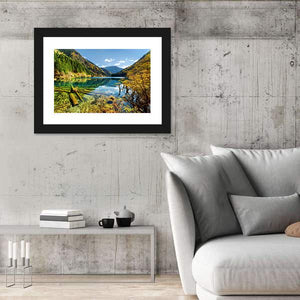 A wide-angle view of a mountain lake framed by forest and fallen trees, with logs visible just beneath the clear water. The blue, green and warm brown tones create a serene, picturesque atmosphere that suits house room decor and modern interiors like living rooms or bedrooms.