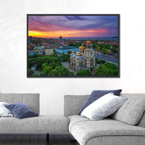 Cathedral Of The Assumption In Varna shows the cathedral’s golden domes against a coastal city skyline at sunset. The photorealistic cityscape carries a vibrant, serene, majestic mood with purple and gold skies — a good fit for modern home decor and living spaces.
