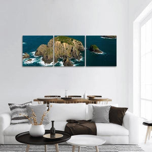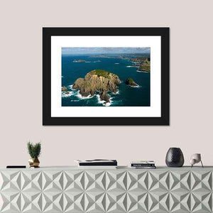 A panoramic view of the Cavalli Islands shows rocky islands, ocean and white surf, capturing a dramatic yet serene coastal scene. This realistic nature-photography print suits coastal or modern room decor where a natural, calming focal point is wanted.