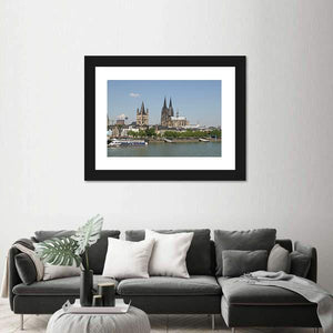 A photorealistic view of the city along the River Rhine, featuring a cathedral with two tall spires, boats on the river, and riverside buildings. The rule-of-thirds composition and a blue, brown, grey and green palette give a bright, sunny daytime feel that suits modern home or office walls.