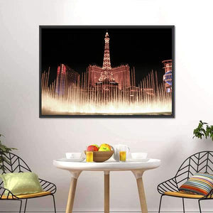 This vibrant canvas art features the iconic Eiffel Tower replica and dancing fountains of Las Vegas. With its energetic colors of gold, red, and black, it adds a dramatic flair to modern décor.