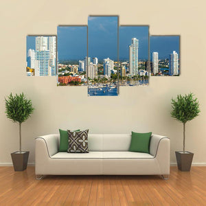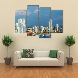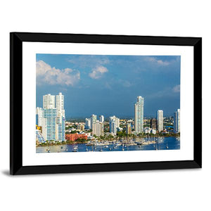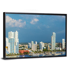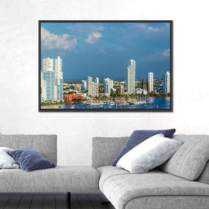 This canvas wall art captures a vibrant city skyline, showcasing a bustling marina filled with sailboats and towering skyscrapers. The sunny composition features a beautiful palette of blues and greens, perfect for brightening up any room.