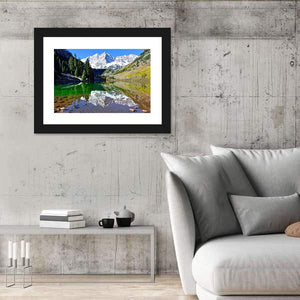 This canvas art showcases the majestic Maroon Bells, reflecting in a tranquil lake surrounded by autumn foliage. Its serene palette of greens, whites, and browns creates a calm atmosphere, making it a beautiful addition to any nature-inspired decor.