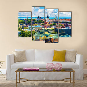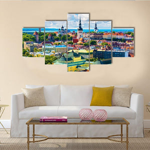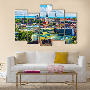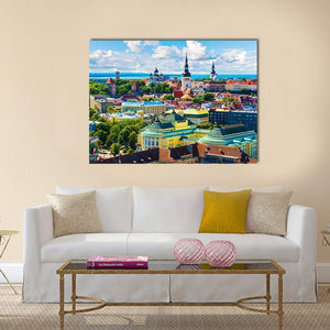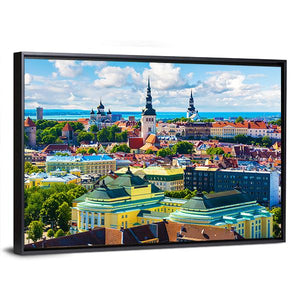Experience the vibrant charm of Tallinn with this aerial view of the historic old town. Pointed spires, red-tiled roofs, and lush green trees come together under a clear blue sky, creating a captivating scene that brings color and life to any wall.