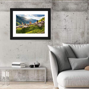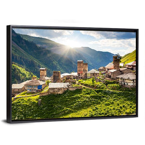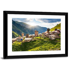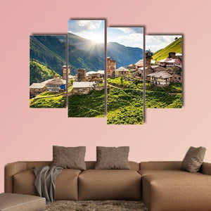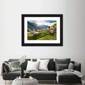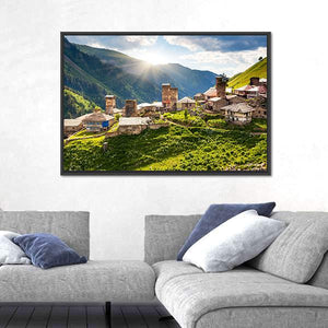 A realistic landscape of the mountain village Adishi in Georgia, where stone watchtowers rise above green hills and rocky terrain. Sunbeams and a palette of green, brown, blue, yellow and grey give the scene a serene, historic, majestic feel that suits a modern living room or study.