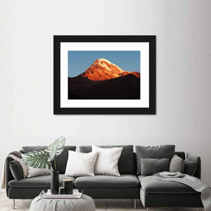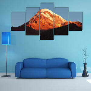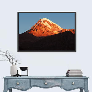 This canvas art captures the majestic view of Kazbegi volcano, showcasing its snow-capped peak illuminated by warm sunlight. The serene landscape, rendered in shades of orange, white, blue, and dark brown, adds a touch of nature’s beauty to any wall.