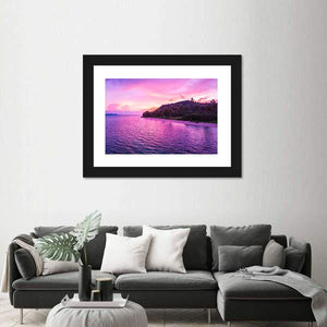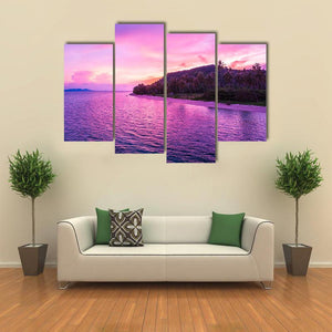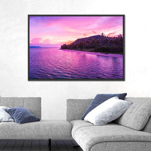 This canvas depicts a tropical beach and sea at sunset, with palm trees and a vibrant purple-pink sky over calm ocean waters. Its realistic landscape and tranquil, tropical mood suit coastal or modern living spaces and nature-inspired rooms.