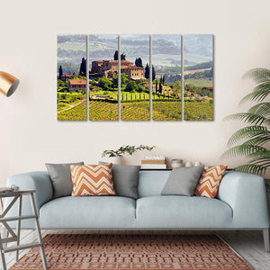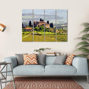 Capture the serene beauty of Tuscany with this captivating canvas wall art featuring a tranquil vineyard scene. Rolling hills and cypress trees blend beautifully with charming terracotta roofs and rows of grapevines, creating an idyllic atmosphere perfect for any space.