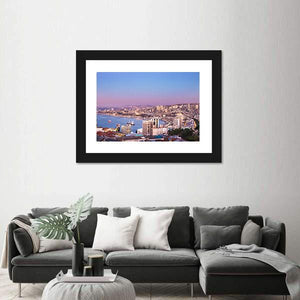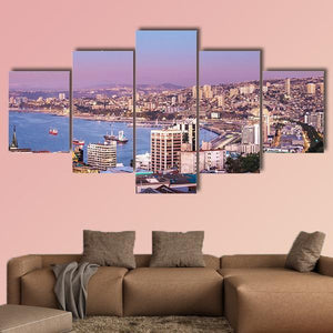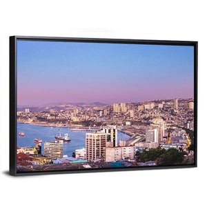 A photorealistic canvas showing an aerial view of Valparaiso Bay, with city buildings on steep hills, ships in the water, and a clear, dusk-tinged sky. Soft blues, pinks, whites and greys give the scene a peaceful, expansive mood that fits modern living rooms, hallways, or home offices.