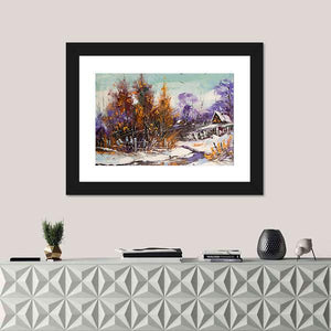 This impressionistic canvas captures a serene winter scene, featuring a snowy landscape with a cozy cabin and tall trees. The textured brushstrokes convey depth, bringing the peaceful atmosphere of a winter village to life.