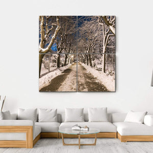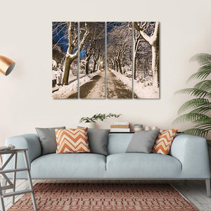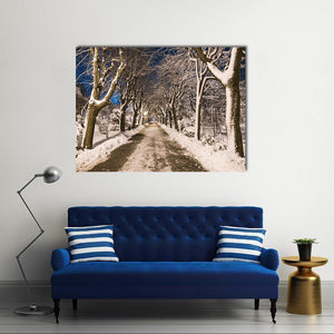 This serene canvas art captures a peaceful winter scene with a snowy path lined by trees and glowing streetlights. Its tranquil palette of blue, white, and brown evokes a quiet, cold atmosphere that is perfect for adding a touch of nature to your home.