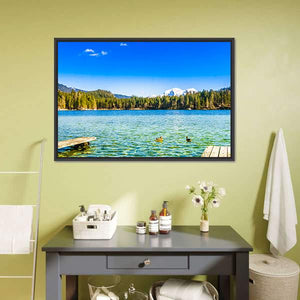 A photographic landscape of Lake Hintersee, showing clear turquoise water, a dock, two ducks, and forested shores with snow-capped mountains. The calm, natural scene reads as serene and peaceful and suits modern or nature-inspired room decor.