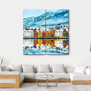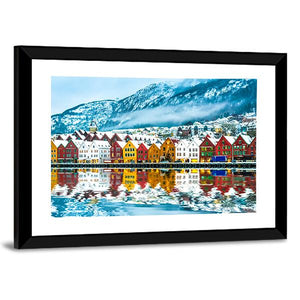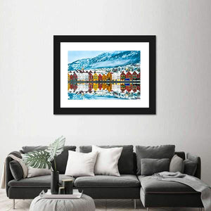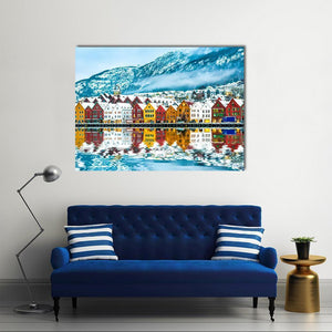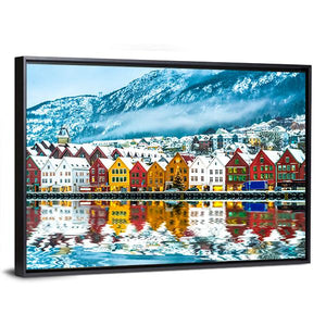 This canvas art captures a vibrant scene of colorful buildings nestled against snowy mountains in Bergen, Norway. The serene reflections in the water enhance the picturesque quality, making it a delightful addition to any space.