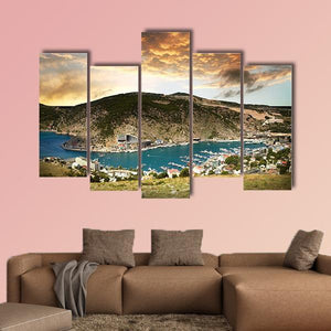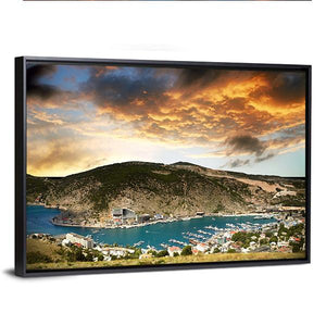 This realistic landscape captures a high-angle view of a coastal harbor with numerous boats below rolling hills and distant mountains. Deep blues and greens meet warm orange and brown accents under dramatic clouds, giving the scene a dramatic yet serene mood. Suited to modern homes and coastal-inspired rooms as wall decor.