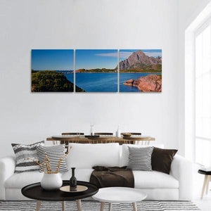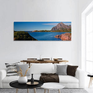 Orsvagvaer Village Panoramic Canvas Wall Art depicts a serene coastal landscape with a rocky shore, treed hillside, jagged mountains and open sky meeting the ocean. The photorealistic, panoramic scene feels expansive and natural. It suits living rooms or nature-inspired spaces that favor blue-green scenic decor.