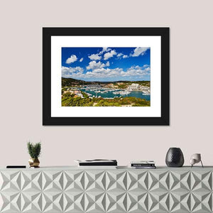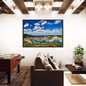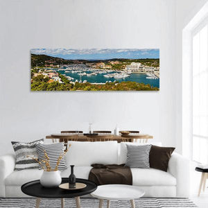 Marina of Porto Cervo is captured in a wide panoramic canvas showing yachts, sailboats, a sunlit coastline and Mediterranean-style buildings. The realistic, scenic image uses blue, green, white and tan to create a serene yet vibrant, picturesque mood that suits coastal or Mediterranean-inspired rooms.
