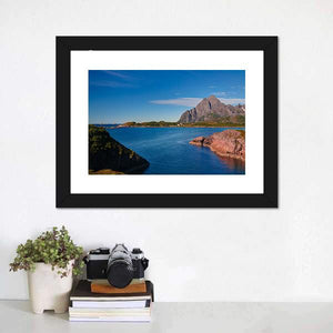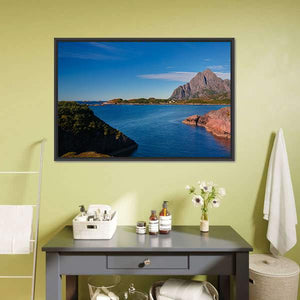 Orsvagvaer Village Canvas Wall Art captures a serene coastal landscape of rocky islands, forested hills and a jagged mountain peak beside calm blue water. Its clear, majestic mood and cool blue-green palette suit modern or coastal room decor.