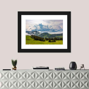 From Rigi Kulm in Switzerland, this realistic landscape shows layered grassy hills, pine trees, puffy clouds and distant snow-capped peaks. The green, blue, white and gray palette creates a peaceful, serene, and majestic atmosphere. It works well in modern or nature-inspired rooms.