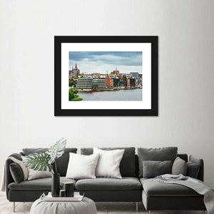 A photographic cityscape of Rostock’s port and waterfront buildings, featuring a church spire and a long red boat beneath an overcast sky. Muted blues, greens, browns and grays create a calm, urban mood that suits modern living rooms or entryways.