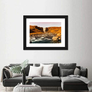 View to the Waterfall in Iceland presents a wide panoramic scene of a cascading waterfall, fast-flowing river, sheer rock faces, and mountain slopes. Rendered in a realistic style with orange, brown, white, and grey tones, the image feels dramatic and powerful and works well in modern or nature-themed rooms.