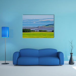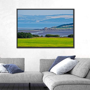 This photorealistic landscape captures a long bridge crossing serene waters, surrounded by lush green fields and hazy distant hills. The peaceful palette of blues, greens, and tans evokes a sense of openness and tranquility, making it a lovely addition to any wall.