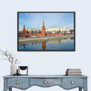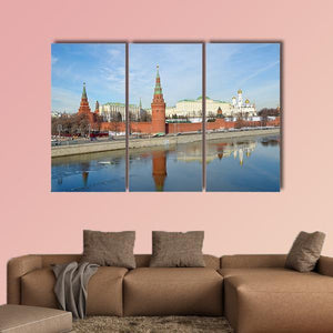 Views of the Moscow Kremlin and Kremlevskaya Embankment shows the Kremlin towers and buildings reflected on the Moscow River. The realistic, wide eye-level scene feels historic and serene, with dome-shaped roofs, an icy river surface, and a clear blue sky with clouds. It suits modern living rooms or home offices as a calm focal point.