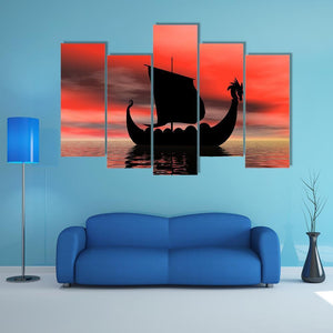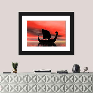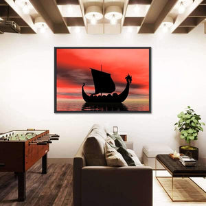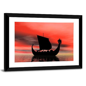 A centered scene of a Viking ship silhouetted against a red-orange ocean sunset, with a dragon-headed prow, single sail, and their reflection on calm water. The image reads as dramatic, peaceful, and mysterious, and pairs well with modern home decor.