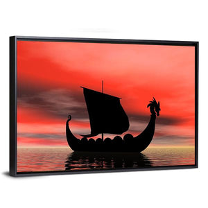 This captivating canvas features a powerful viking ship silhouetted against a dramatic sunset. The striking palette of red, orange, and blue evokes a serene yet epic atmosphere, perfect for adding interest to your space.