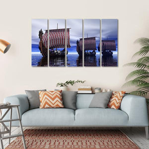 This canvas wall art features three Viking ships sailing across a serene ocean under a cloudy sky. The adventurous scene captures a sense of history, with striped sails and shields lining the ships, creating a stunning focal point for any room.