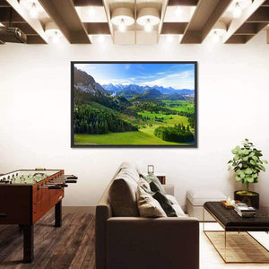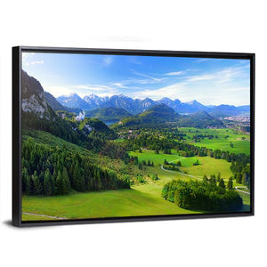 This realistic landscape canvas depicts the village of Hohenschwangau in Germany with a castle perched on a hill, dense forest in the foreground, and snow‑capped mountains beyond. The green, blue and gray palette creates a peaceful, majestic, idyllic atmosphere. Suits modern interiors and room decor that favor nature-focused art.