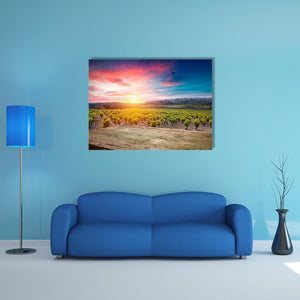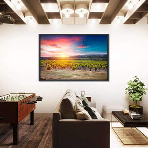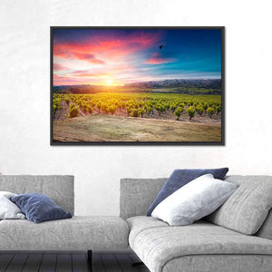 A serene, warm vineyard at sunset in the Chianti region, this canvas print shows rows of green vines beneath an orange-pink sky and a single bird in flight. The composition emphasizes depth and rule-of-thirds balance, creating a calm yet vibrant scene that fits modern home decor and contemporary living or dining rooms.