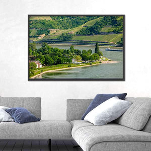 A realistic landscape canvas showing an aerial view of the Rhine Valley with terraced vineyards, a river with a barge, and houses and trees along the bank. Greens, blues, browns and white create a serene, idyllic mood that suits modern and nature-themed rooms.