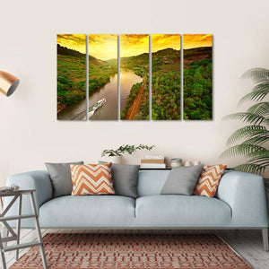 This canvas wall art captures a serene landscape of the River Douro, dotted with lush vineyards and framed by rolling hills. The warm colors of sunset cast a picturesque glow over the scene, inviting a sense of peace to any room.