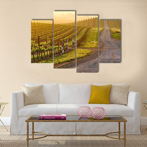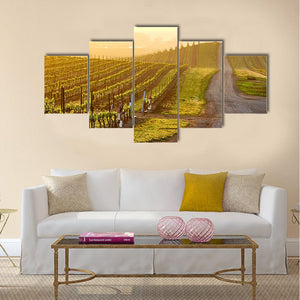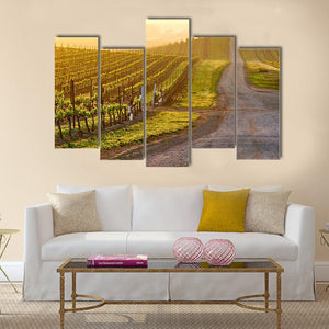 This canvas art captures a serene vineyard landscape at sunrise in California. A peaceful gravel road meanders through rows of lush vines, bathed in warm sunlight against rolling hills. It's a beautiful addition for nature lovers seeking tranquil décor.