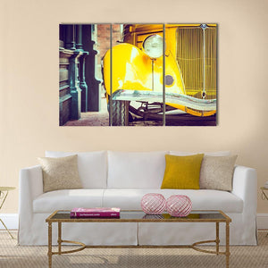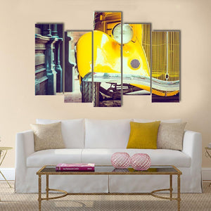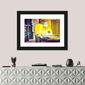 A close-up study of a vintage car headlight, grille and chrome bumper captured from a low angle. Warm yellows with chrome, brick and teal accents create a nostalgic, classic and vibrant mood that suits living rooms, offices, or automotive-themed room decor.