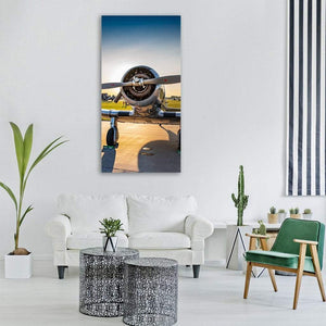 A close-up of a vintage fighter airplane centered on its radial engine and single propeller, pictured on a tarmac under a clear sky. Rendered in silver, blue, yellow, and grey with a nostalgic, powerful mood, it suits aviation-themed, military-inspired, or retro rooms.
