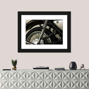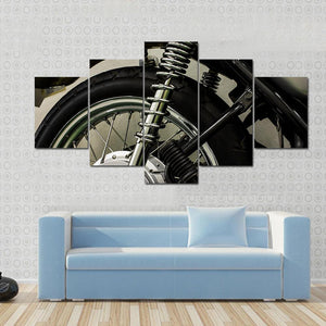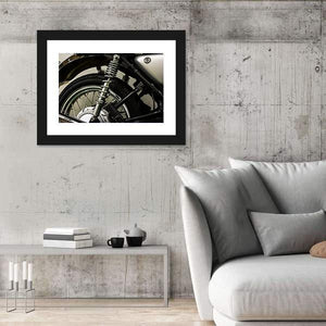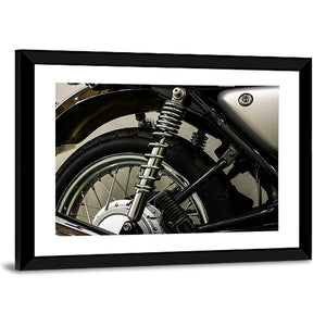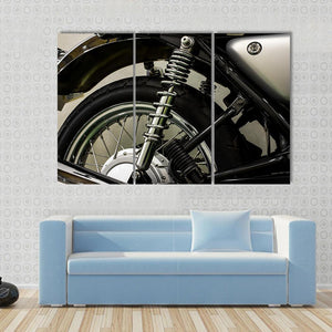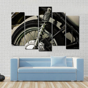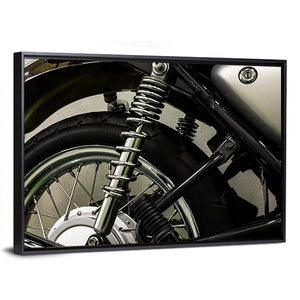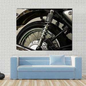 This striking canvas art features a close-up detail of a motorcycle, showcasing the intricate elements like the chrome shock absorber and wire spokes. With an industrial vibe, it brings a strong, mechanical atmosphere to any room.