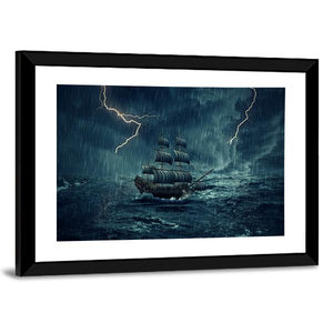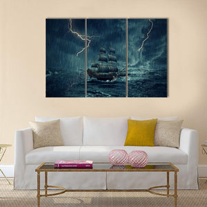 A ship struggles through a stormy night at sea, with heavy rain, crashing waves, and multiple lightning strikes centered in the scene. Rendered in a realistic, dramatic style using dark blue, gray, white, and flashes of yellow, it conveys an intense, perilous mood and fits nautical or modern room decor.