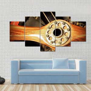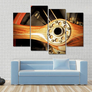 This canvas wall art features a close-up of a vintage wooden aircraft propeller and engine cylinders, exuding an industrial charm. The palette of rich browns, golds, and greys adds depth, making it a striking piece for any decor.